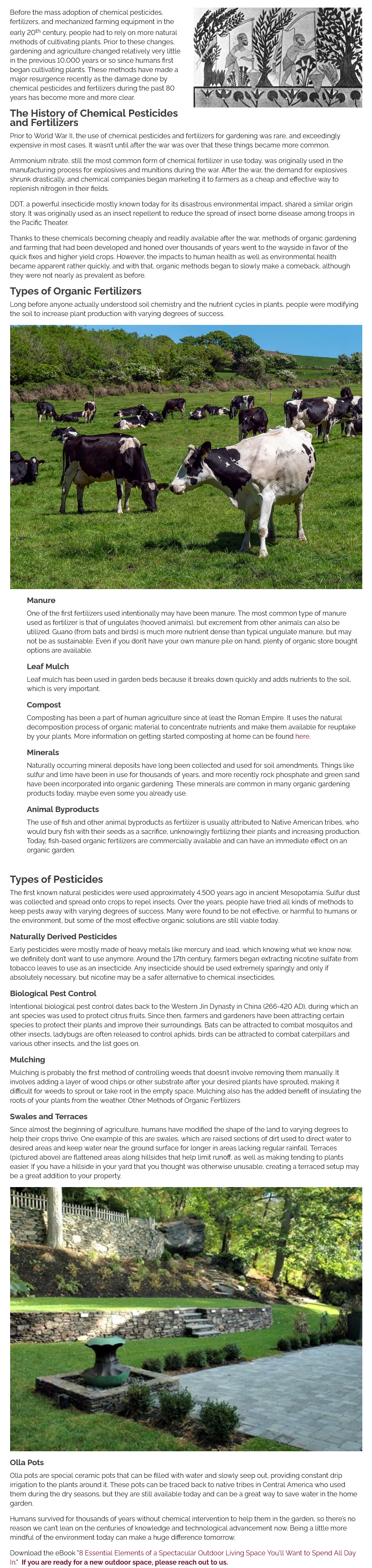 Before the mass adoption of chemical pesticides, fertilizers, and mechanized farming equipment in the early 20th century, people had to rely on more natural methods of cultivating plants. Prior to these changes, gardening and agriculture changed relatively very little in the previous 10,000 years or so since humans first began cultivating plants. These methods have made a major resurgence recently as the damage done by chemical pesticides and fertilizers during the past 80 years has become more and more clear. (Ghostwritten Article)